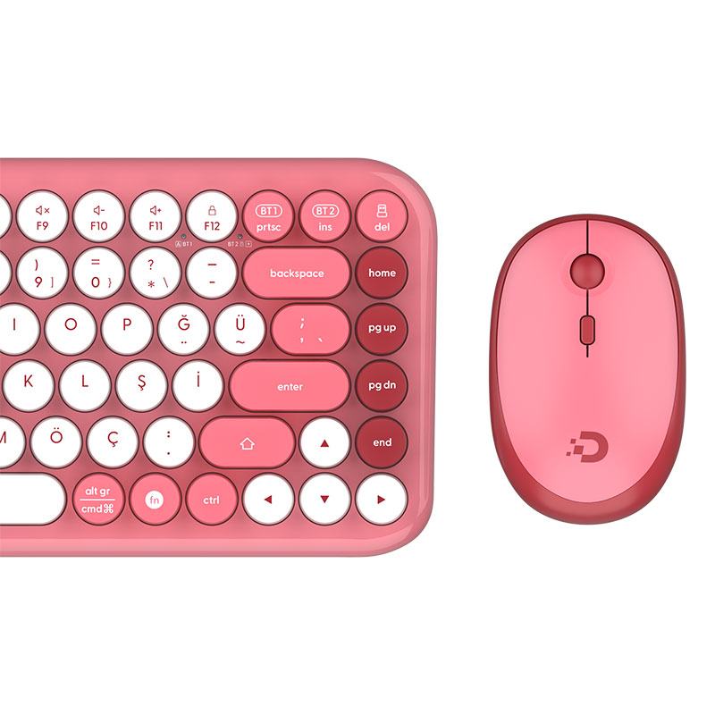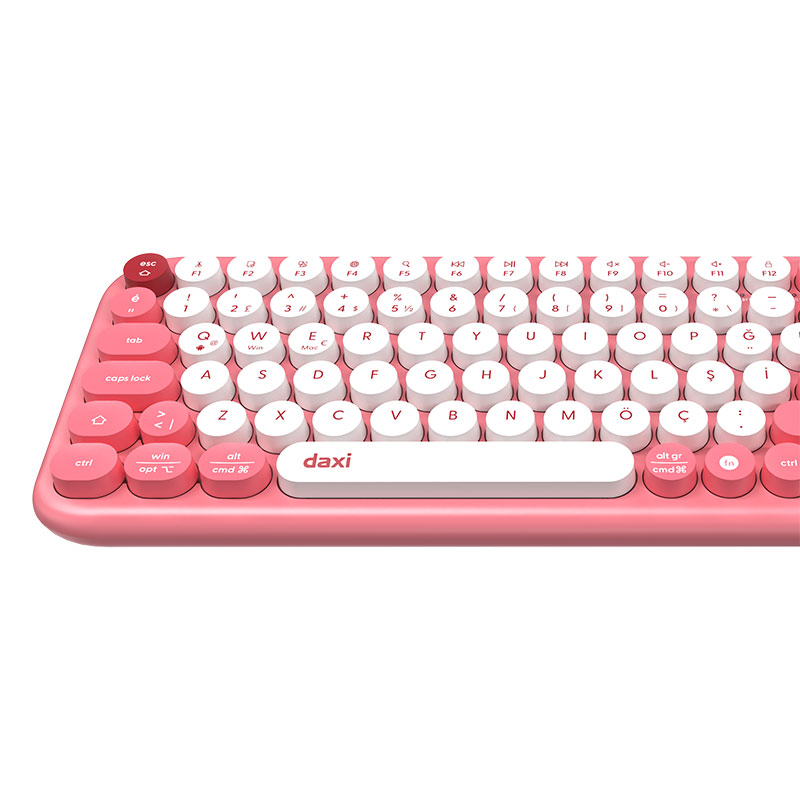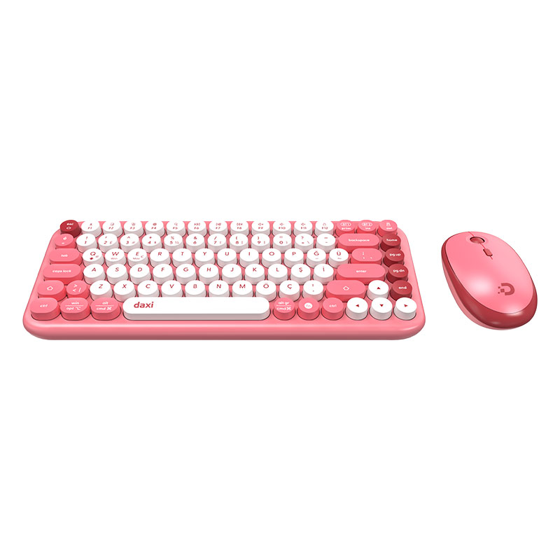 Daxi MK-340 Kablosuz Klavye Mouse Set, retro tasarımı ve pembe-beyaz renk kombinasyonu ile estetik ve dikkat çekici bir kullanım deneyimi sunar. Bluetooth ve 2.4GHz kablosuz bağlantı desteği sayesinde farklı cihazlarla kolayca eşleşebilir ve kesintisiz performans sağlar. Q klavye düzeni, hızlı ve konforlu yazım imkânı sunar. Yuvarlak tuş tasarımı, nostaljik bir görünüm oluştururken aynı zamanda yumuşak ve rahat basım hissi sağlar. Ergonomik yapısı sayesinde uzun süreli kullanımlarda el ve bilek konforunu destekler. Kablosuz yapısı, masaüstünde düzen sağlayarak kablo karmaşasını ortadan kaldırır. Tak-çalıştır özelliği ile hızlı ve kolay kurulum imkânı sunar. .