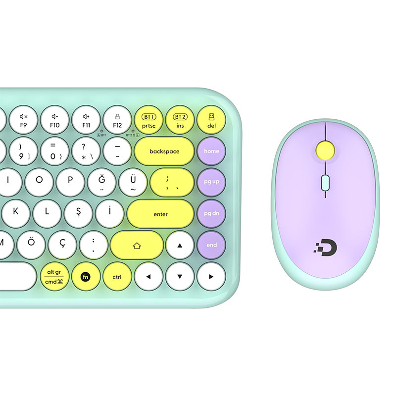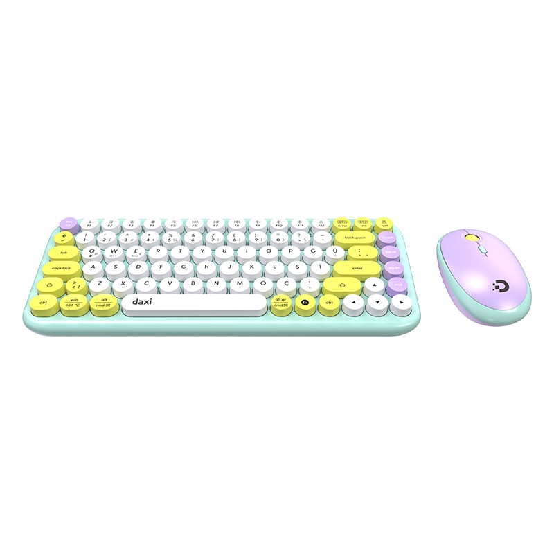 Daxi MK-340 Kablosuz Klavye Mouse Set, retro tasarımı ve yeşil-beyaz renk kombinasyonu ile dikkat çeken şık bir settir. Bluetooth ve 2.4GHz kablosuz bağlantı desteği sayesinde farklı cihazlarla kolayca eşleşebilir ve kesintisiz kullanım sağlar. Q klavye düzeni ile hızlı ve rahat yazım deneyimi sunar. Yuvarlak tuş tasarımı, nostaljik bir görünüm sağlarken aynı zamanda konforlu bir kullanım hissi verir. Ergonomik yapısı, uzun süreli kullanımlarda el ve bilek konforunu destekler. Kablosuz kullanım özelliği ile masa üzerinde düzen sağlar ve kablo karmaşasını ortadan kaldırır. Tak-çalıştır özelliği sayesinde kolay kurulum imkânı sunar.