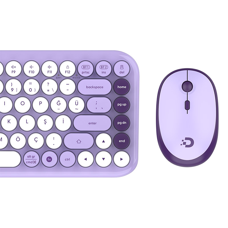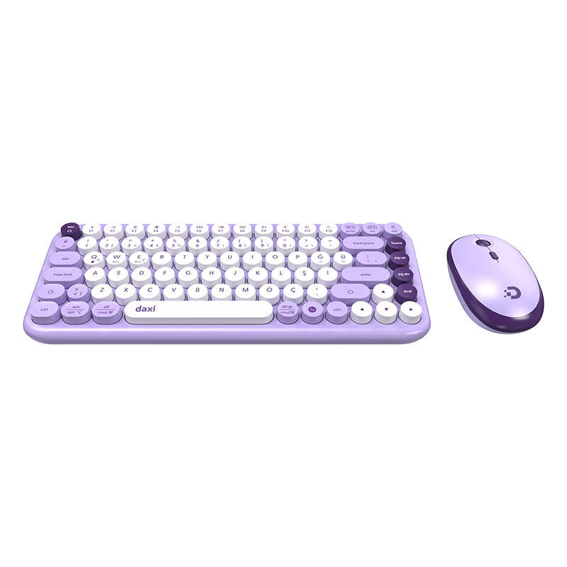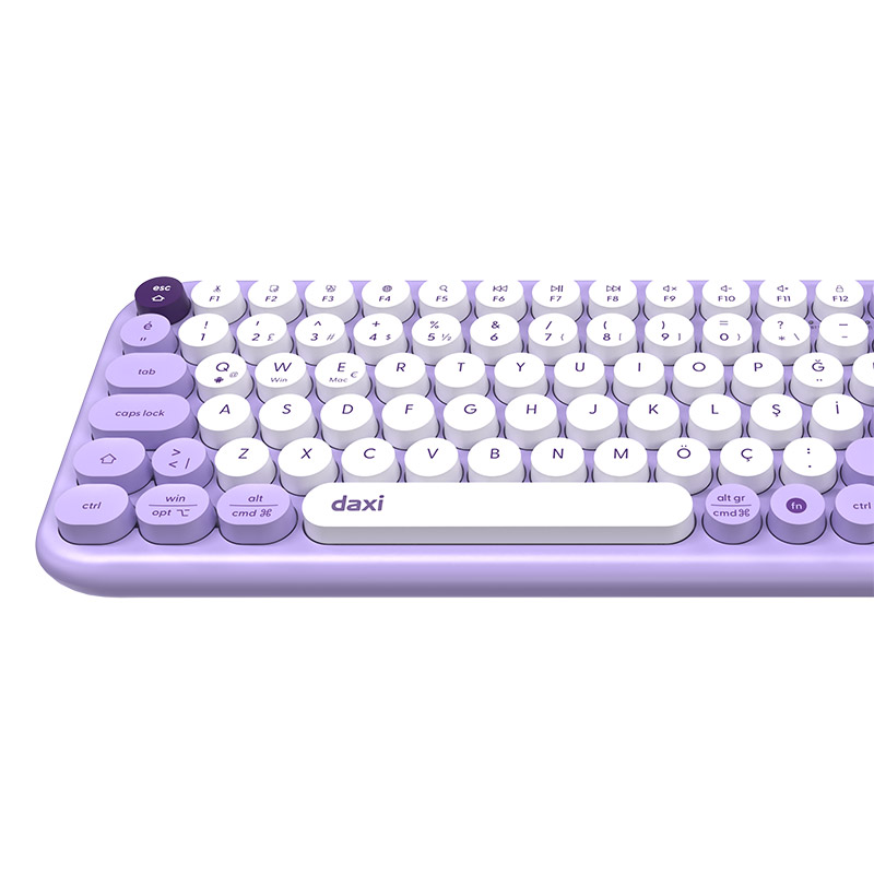 Daxi MK-340 Kablosuz Klavye Mouse Set, lila-beyaz renk kombinasyonu ve retro tasarımı ile dikkat çeken şık bir settir. Bluetooth ve 2.4GHz kablosuz bağlantı desteği sayesinde farklı cihazlarla hızlı ve sorunsuz bir şekilde eşleşir. Q klavye düzeni, kullanıcıya rahat ve akıcı bir yazım deneyimi sunar. Yuvarlak tuş yapısı, nostaljik bir görünüm sağlarken aynı zamanda konforlu kullanım hissi oluşturur. Ergonomik tasarımı sayesinde uzun süreli kullanımlarda el ve bilek konforunu destekler. Kablosuz kullanım özelliği, masaüstünde düzen sağlayarak kablo karmaşasını ortadan kaldırır. Tak-çalıştır özelliği ile ekstra kurulum gerektirmeden pratik kullanım sunar.
