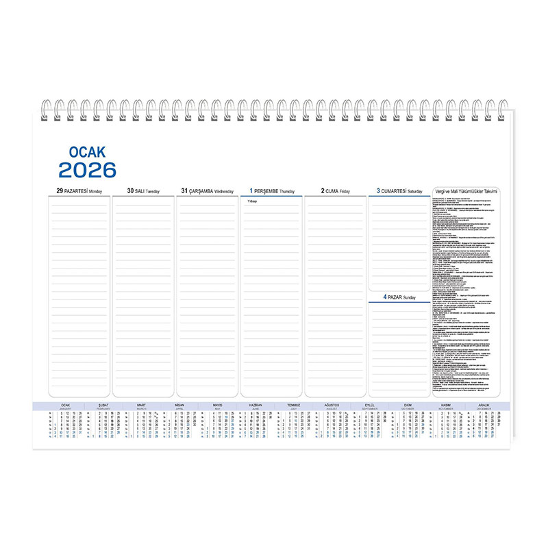 Bu masa sümeni, özellikle masa başı çalışanları için büyük bir kolaylık sağlar. Haftalık görevlerinizi göz önünde tutarak unutmadan işlerinizi planlamanıza yardımcı olur. 28x40 cm ölçüsüyle masada fazla yer kaplamadan, geniş bir yazım alanı sunar. Spiralli yapısı, kullanım kolaylığı sağlayarak sayfaları hızlıca çevirmenizi mümkün kılar. Planlama alışkanlığı kazanmak isteyen öğrenciler ve profesyoneller için oldukça işlevseldir. Her haftayı ayrı ayrı düzenlemenizi sağlayarak görsel bir takvim desteği sunar. Zamandan tasarruf etmenize yardımcı olur ve işlerinizi sıraya koyarak daha üretken olmanızı sağlar. Modern ve sade tasarımı ile çalışma ortamınıza düzen ve şıklık katar.
